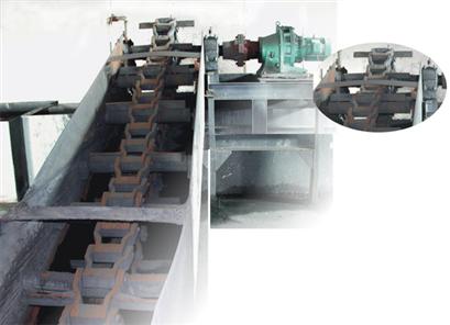 (一)結(jié)構(gòu):南主動(dòng)鏈輪、從動(dòng)鏈輪、鏈條、減速器、電機(jī)、鋼板槽、托輥、壓輥、支架等組成。鋼槽或水泥渣溝底用耐磨材料鑲制,槽內(nèi)用水封。漏灰斗口必須插人槽內(nèi)水面以下,達(dá)到水封目的。